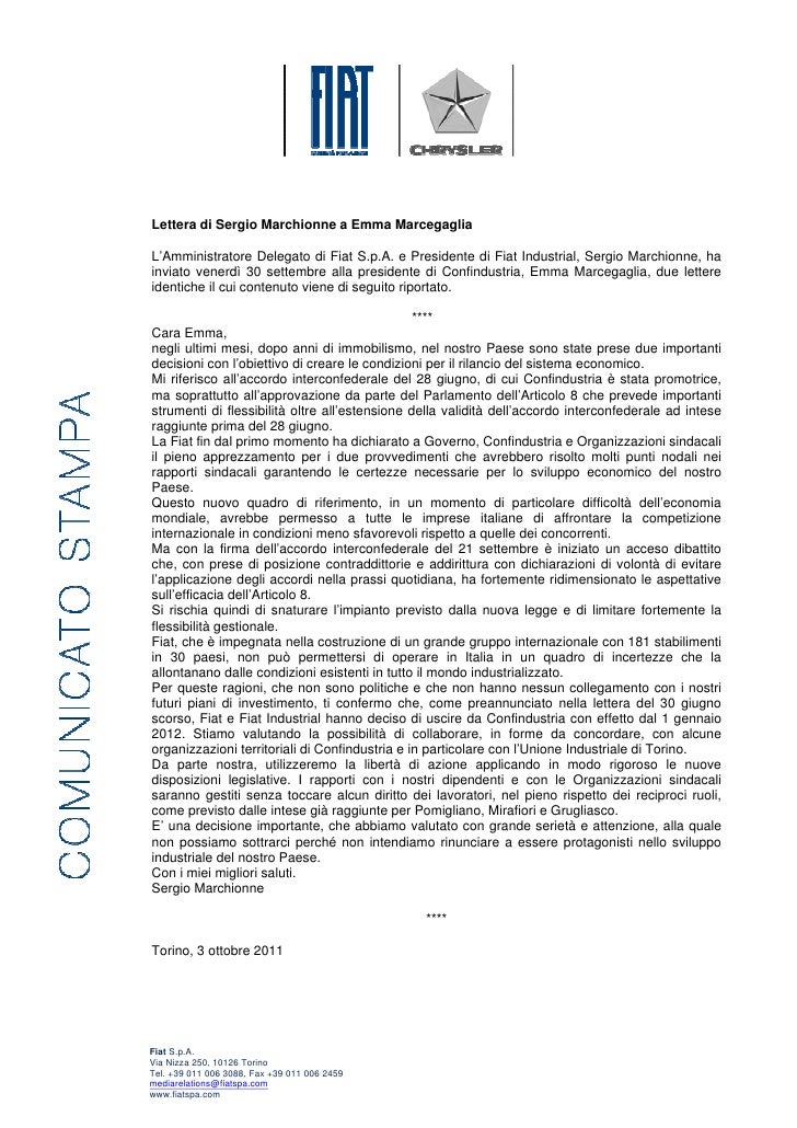 La lettera di Marchionne:"Caro collega, esiste un mondo in ... - Libera TV Una lettera di benvenuto ma anche motivazionale, per imprimere immediatamente la sua filosofia ai neo dipendenti. Dagospia ha pubblicato il testo integrale della missiva. "Esiste un mondo - scriveva Marchionne - in cui le persone non lasciano che le cose accadano. Le fanno accadere.